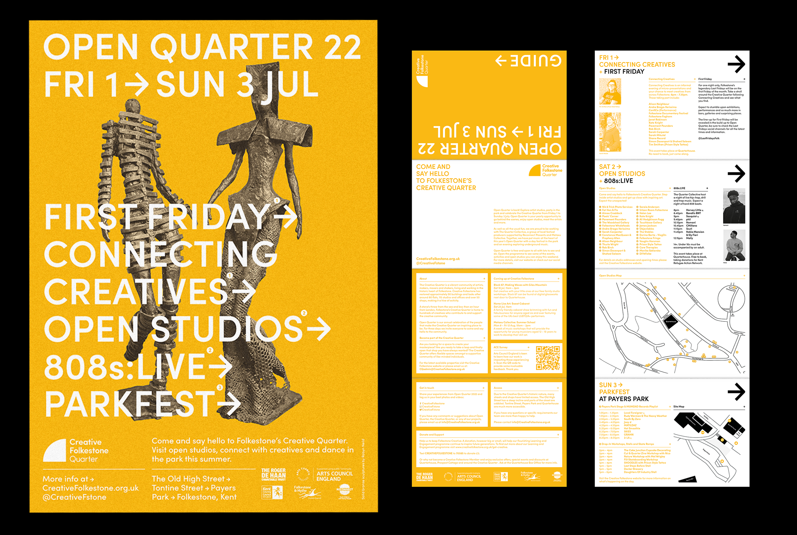 Open Quarter is a celebration of the Creative Quarter in Folkestone. The festival includes, talks, networking events, open studios and day parties. I was tasked with creating this year’s identity.